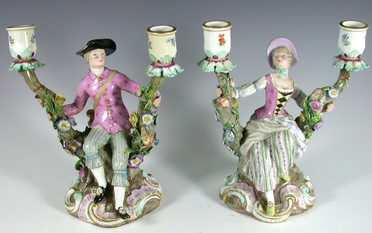 in the form of a man in 18th century costume and his female companion seated with a pink sprigged jacket, each supporting two flower encrusted naturalistic branches supporting flower painted candle sconces, underglazed blue crossed sword mark and impressed number marks