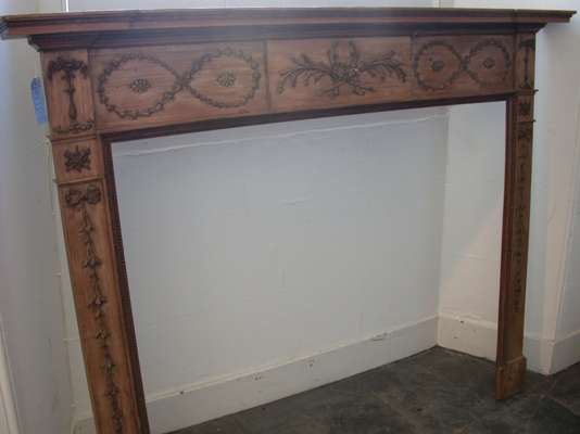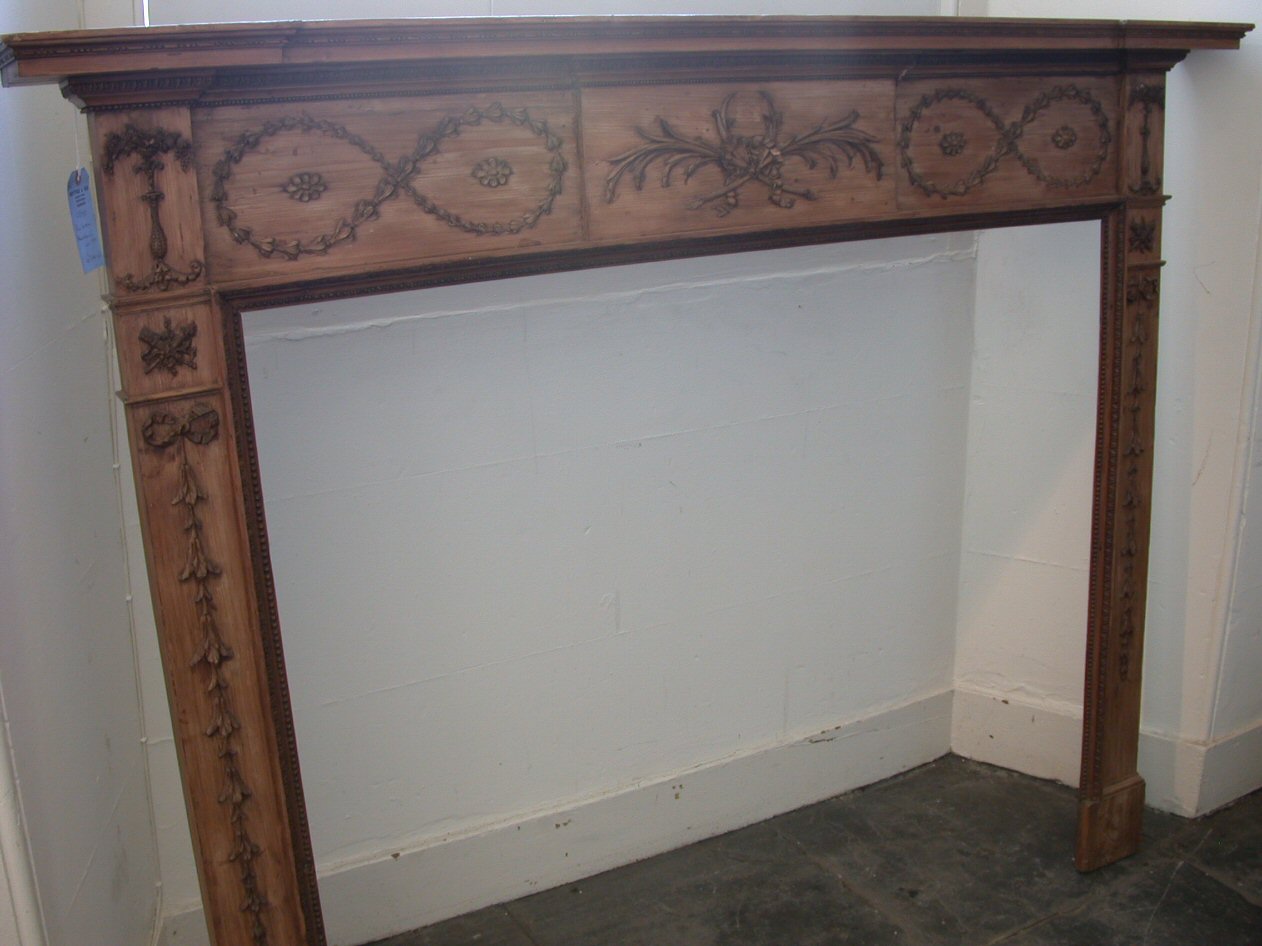the reverse breakfront moulded mantel above central tablet carved with ribbon-tied garlands flanked by applied husk loops, the uprights with ribbon-tied husk pendants