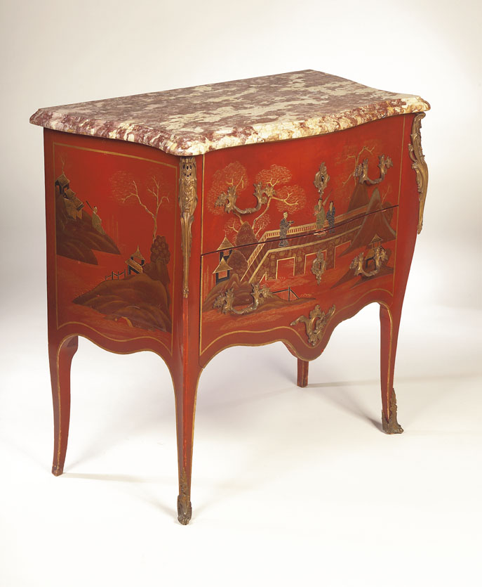 in the mid 18th century style, the serpentine marble top with moulded rim above two graduated long drawers, the whole painted allover in gilt and black with Chinoiserie scenes on a red laquer ground, the whole with giltmetal mounts raised on cabriole legs terminating in cast sabots, oak carcass