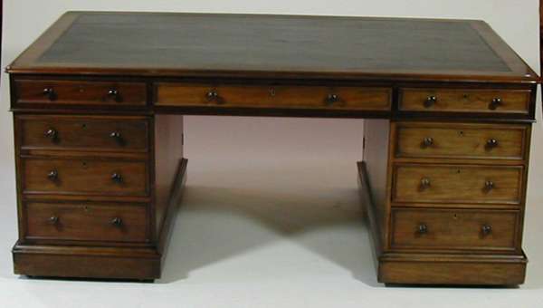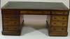 the rectangular top with moulded edge and inset writing surface above three opposing drawers and twin pedestals each with three graduated and panelled drawers opposing panelled cupboards on a plinth