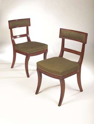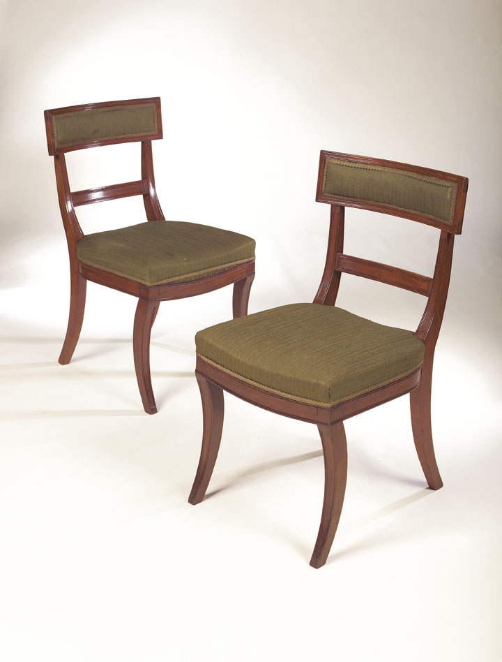each with curved back with inset upholstered panel, above stuffover seat and panelled frieze raised on panelled sabre legs