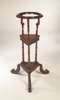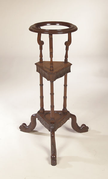 the moulded ring top with curved supports above a gadrooned and moulded triangular tier with single drawer over three ring turned supports on a corresponding triangular tier on three feet carved with grotesque fish