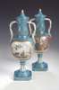 the covers with pointed gilt finials and gilt guilloche frieze on a turquoise ground, the turqoise body with gilt stiff leaf decoration to neck above opposing oval cartouche panels depicting figures and birds in a landscape, surrounded by gilt line, ribbon and flower decoration, on turned column and indented square base, blue painted entrelac mark, date letter codes eeM