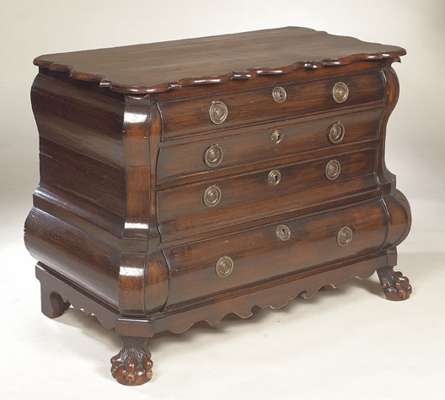 of bombe outline, the shaped top with moulded edge above four long graduated drawers on carved hairy paw front feet