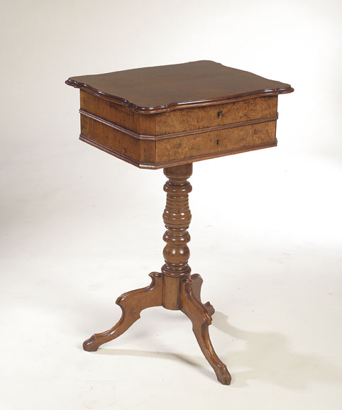 the shaped hinged top above a pull-out drawer fitted with compartments for sewing, above a further drawer and raised on turned column on tripod base