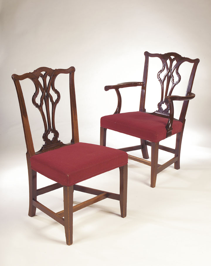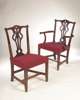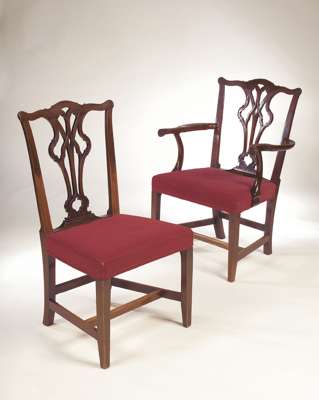 in the Chippendale style, with two carvers, each with serpentine top rail above pierced vase-shaped splats above stuffover upholstered seat on square tapering and chamfered legs linked by stretchers