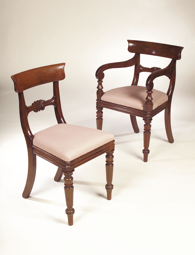 including one carver, each with curved top rail above anthemion carved mid rail and drop-in seat raised on turned and tapering front legs with sabre legs to the rear