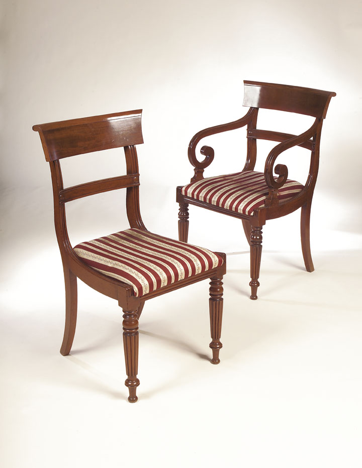 including two carvers, each with slightly curved top rail above reeded uprights and panelled mid rail, the drop-in seat raised on turned and tapering reeded legs