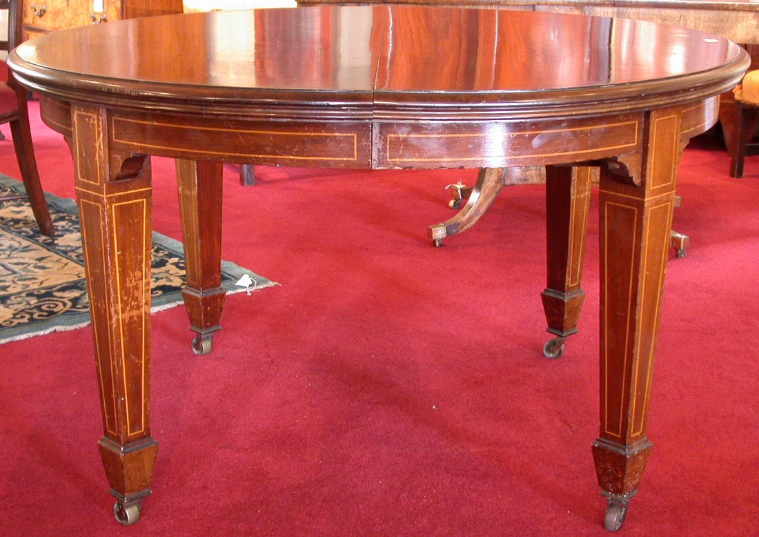 with rounded ends and moulded rim raised on a boxwood strung panelled frieze on square tapering legs with spade feet, brass castors, includes extra leaves
