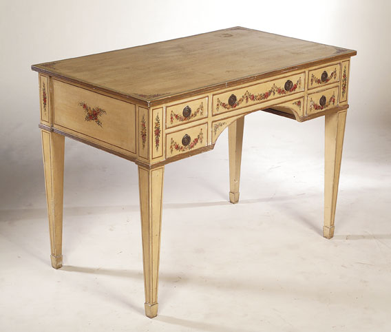 the rectangular top above an arrangement of five false drawers, painted with swags of flowers and raised on square section tapering legs