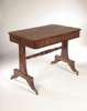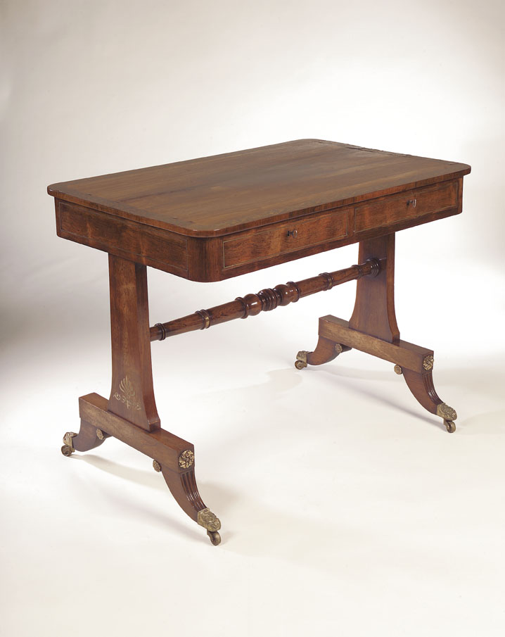 A late Regency rosewood and brass inlaid library table,