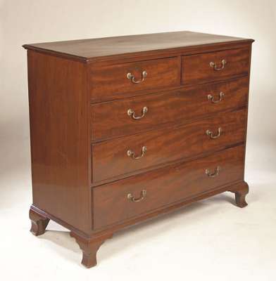 the moulded rectangular top above two short over three long drawers raised on bracket feet