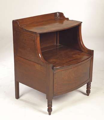 the three quarter gallery above hinged bowed shelf and corresponding hinged shelf below, enclosing aperture for commode, the panelled front raised on turned legs
