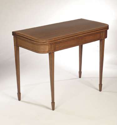 A George III mahogany and satinwood crossbanded foldover tea table,