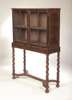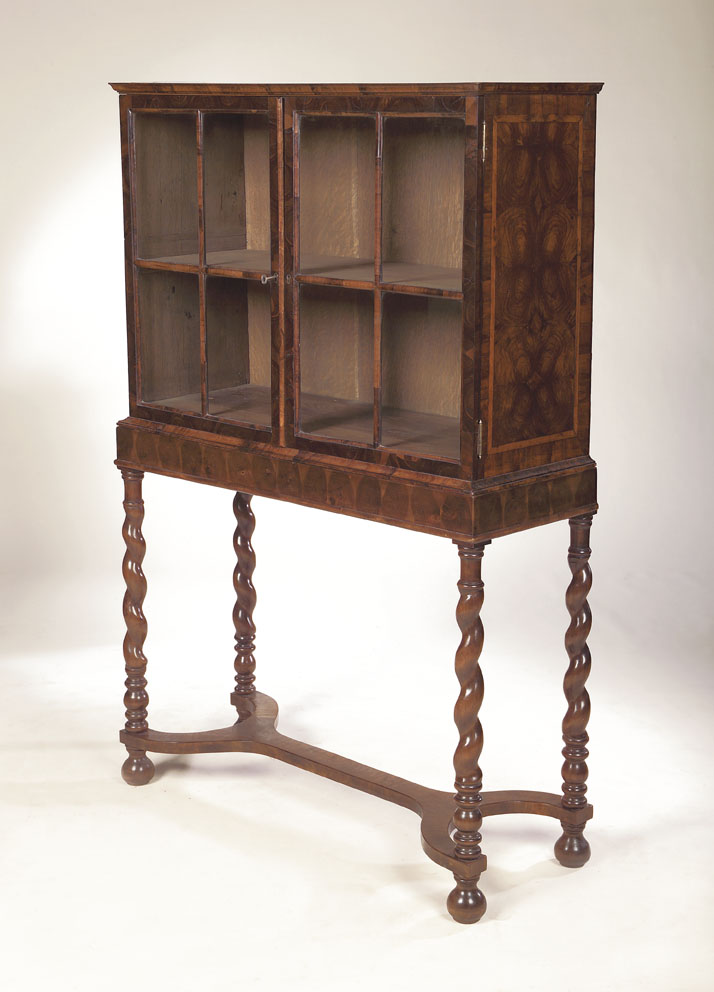early 18th century elements, the projecting cornice above twin astragal glazed doors enclosing a shelf, the sides with oyster veneered panelling, above plain frieze, the base with barley twist supports linked by shaped stretcher on bun feet
