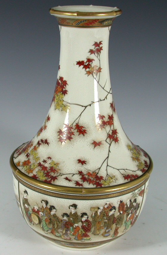 the rim and body with applied gilt simulated bamboo frieze, the flared neck painted with maple branches and leaves above opposed figural panels, and panels with plants by a stream