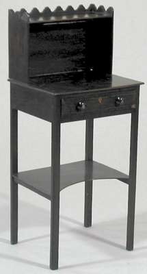 the superstructure with scalloped gallery and open shelf above crossbanded top and single drawer, the whole raised on square moulded legs linked by a lower tier