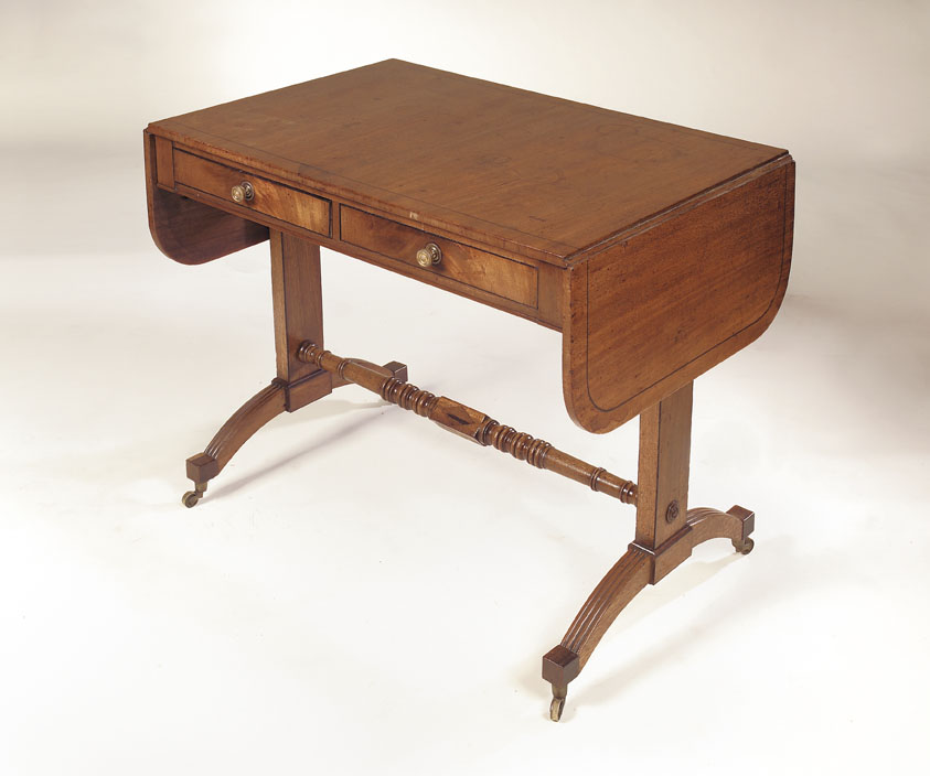 a rounded rectangular top with hinged flaps, above two frieze drawers opposed by two dummy drawers, raised on rectangular supports linked by a turned and blocked stretcher and raised on curved and reeded legs with brass caps and castors