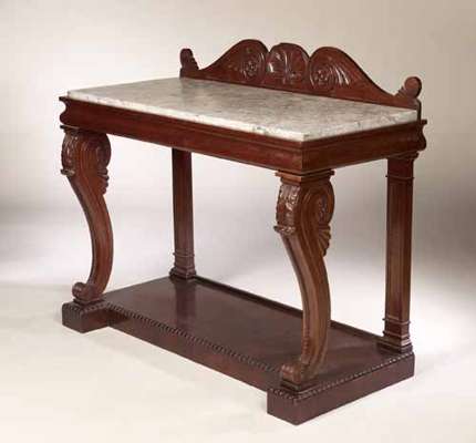 in the manner of William Trotter, the rectangular veined white marble top with shell and scrolled ledge back, above twin scrolling front consoles carved with acanthus leaves and with bead and reel panels, raised on a plinth with bead and reel mouldings