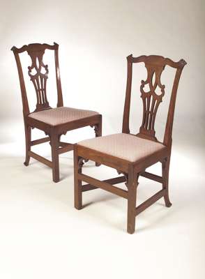 in the George III Chippendale style, each with serpentine top rail with moulded lugs above pierced vase-shaped splats above drop in seat, on square chamfered legs with decorative brackets linked by stretchers