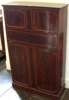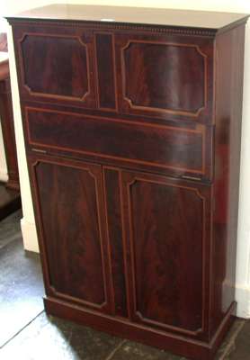 the moulded cornice with inlaid chequer frieze above two panelled doors above a fall front door and two panelled doors below, enclosing pull out galleried shelves, the whole raised on a plinth