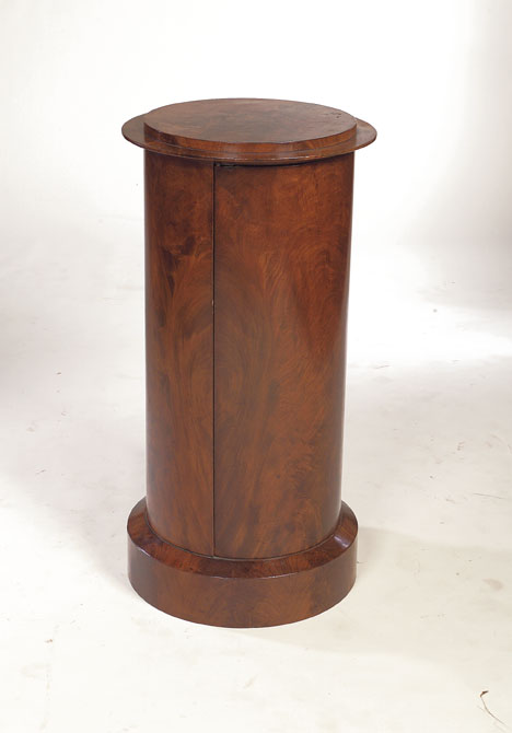 of cylindrical form, the circular top with moulded edge above single door enclosing a shelf and raised on a plinth