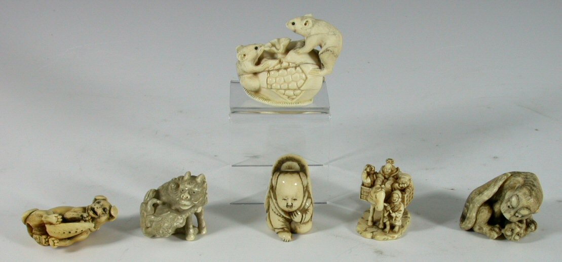 comprising two rats nibbling on a gourd, 6cm; a netsuke of a dog with a large shell, signed, 4cm; a netsuke of a kneeling child with an upturned mask on his back, 3.5cm; a wild cat and cub, signed, 3cm; a seated kylin, 3cm; and another of a horse carrying three figures being led by another figure, 4cm