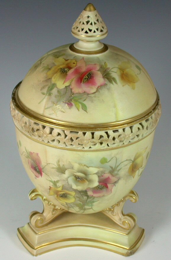 the domed fluted cover with pointed mushroom knop having pierced frieze, the fluted body with flowerhead cast pierced frieze on three scroll feet with plinth, the blush ivory ground painted with red, yellow and cream poppies, blue printed mark and letter code H for 1898, printed number 110/G60H