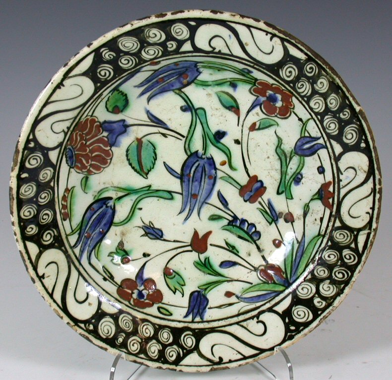 loosely painted with tulips and chrysanthemums in blue, green, brown/red and black, the border with naive scroll and spiral motifs