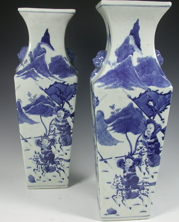 painted in underglaze blue with continuous frieze of warriors on horseback with mountains above, with applied lion mask handles