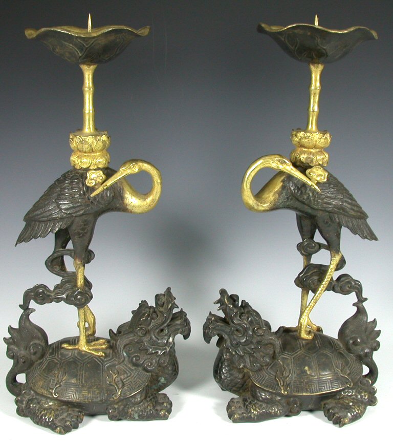 modelled as cranes, the scalloped drip tray above double inverted lotus flower and standing crane on grotesque dragon/tortoise plinth