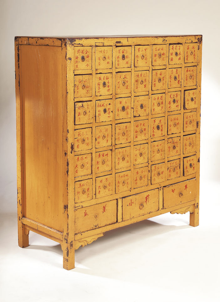 overpainted in ochre, the rectangular top above six rows of seven drawers with three drawers below, each painted with Chinese symbols, the whole raised on square legs with decorative brackets