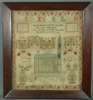 dated 1843, worked in coloured wools into a church surrounded by floral and foliate motifs and reserved on an unbleached linen ground