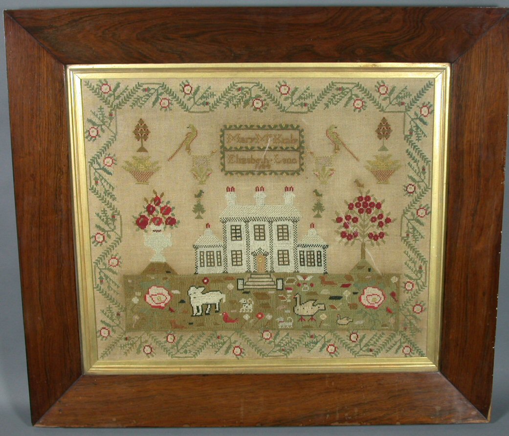dated 1844, worked in coloured wools into a home surrounded by animals and birds with a meandering foliate border reserved on an unbleached linen ground