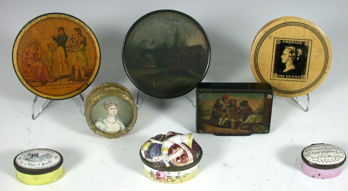 including one 18th century bearing inscription 'Let him love now, Who neved lov'd before, Let him whoever lov'd, Now love the more'; also a giltmetal box, set with painted miniature; also four further boxes