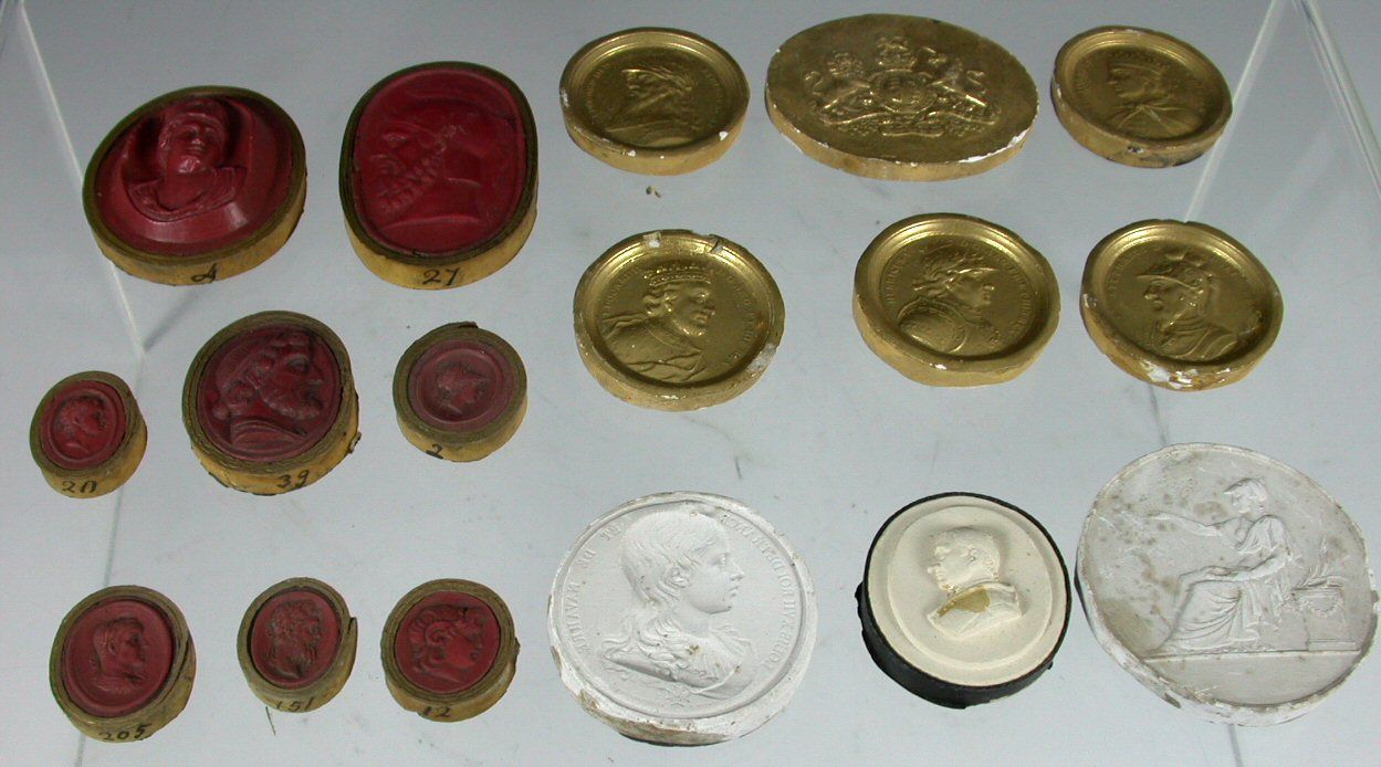 comprising intaglio plaster and wax seals after the antique , also a selection of gilt painted plaster intaglio seals of kings of England, and a quantity of wax letter seals (qty)