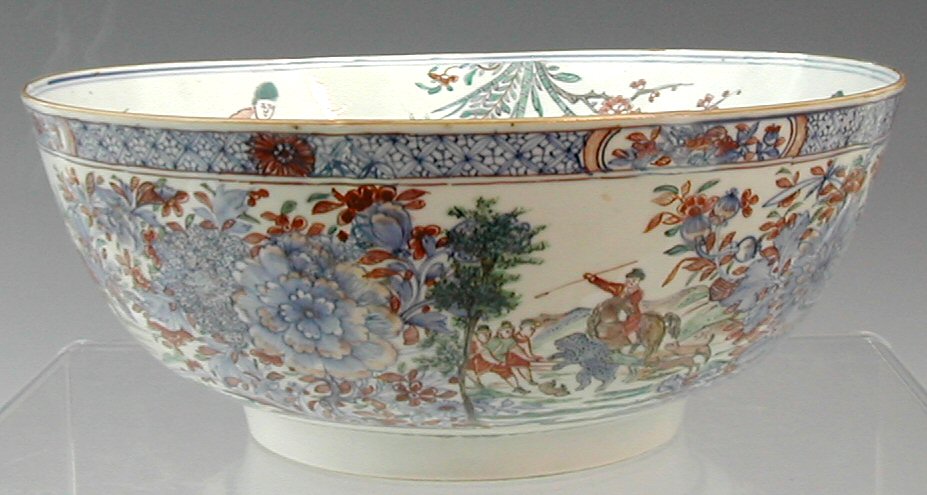 the exterior decorated with four panels of European hunters on horseback with hounds amidst peony flowerheads, the interior with central peony panel, bird, figure and blossom frieze (damaged and restored)