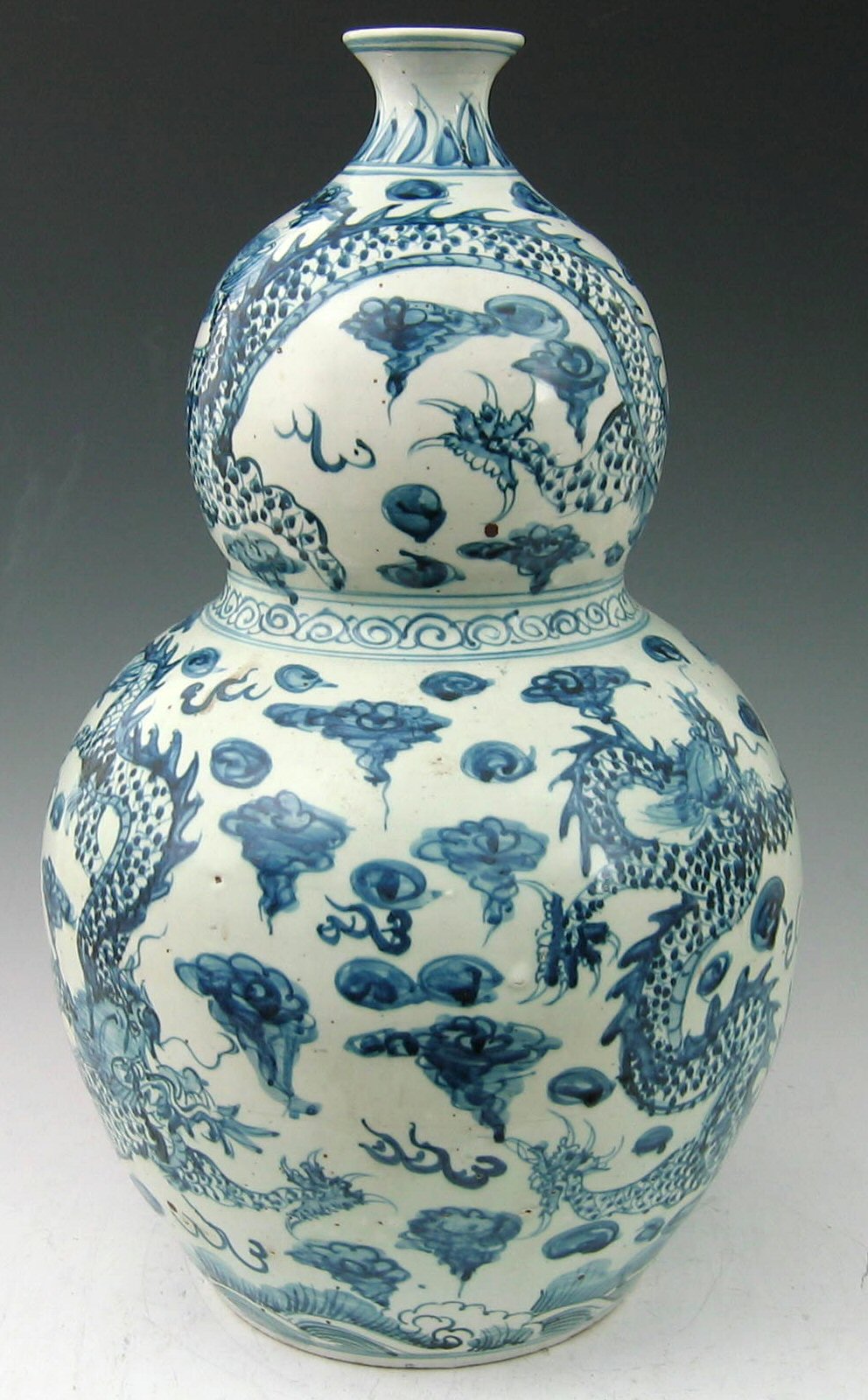with narrow flared neck, the upper section painted with a writhing dragon, the lower section with three similar dragons