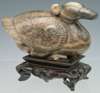 the head carved in relief looking forward, the wings with low relief carving of mythical beasts, on naturalistic wooden plinth set within later carved rectangular stand