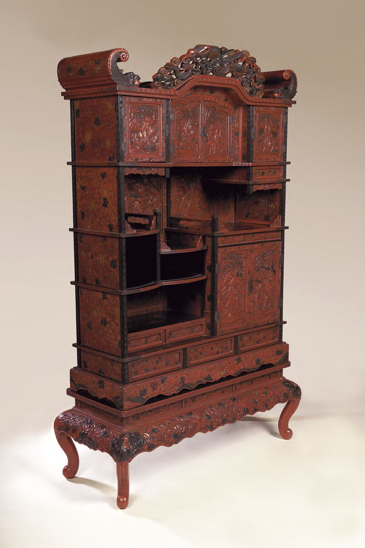 the relief carved lacquer with red ground and green and black highlights, the top with pierced dragon carved cresting above row of reverse breakfront cupboards and arrangement of open shelves, cupboards and drawers, above three base drawers, shaped plinth, the stand with bulbous apron and scrolling legs