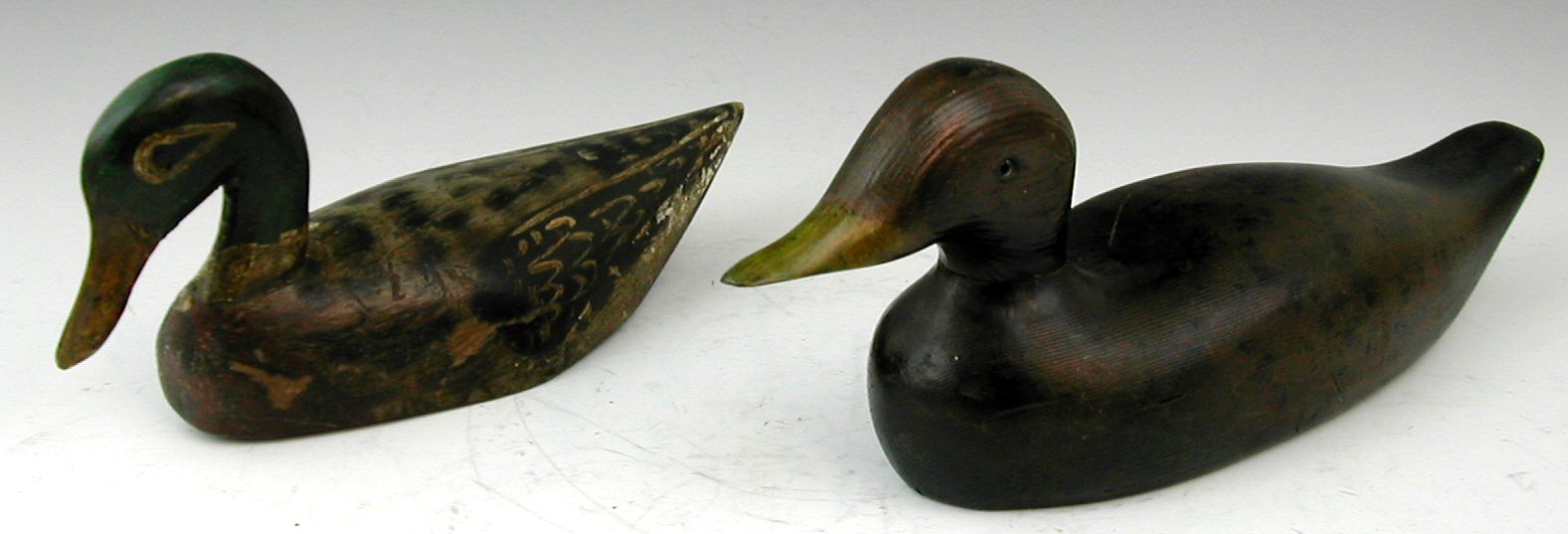 with applied glass eyes, 44cm long; and another overpainted duck decoy, 34cm long (2)