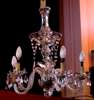 the baluster cut glass column with broad dished spacer, supporting swagged riviere drops and five scrolling and cut glass branches hung with lustres
