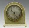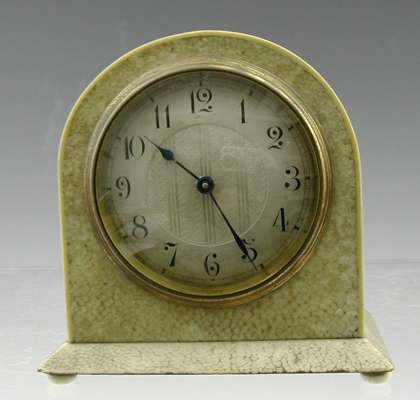 the single train movement with silvered dial enclosed within arched case with tapering plinth on flattened bun feet, stamped mark JC Vickery, Regent Street