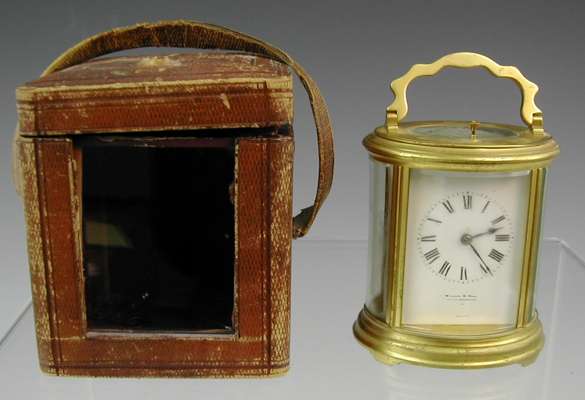 the twin train movement with lever platform escapement, enamelled dial bearing name of retailer Wilson & Gill, Regent Street, in oval corniche case with bevelled glass; Morocco leather carry case