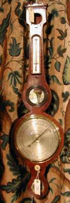 with dry/damp dial, thermometer, circular mirror, silvered pressure dial and spirit level, the shaped case with boxwood and ebony stringing