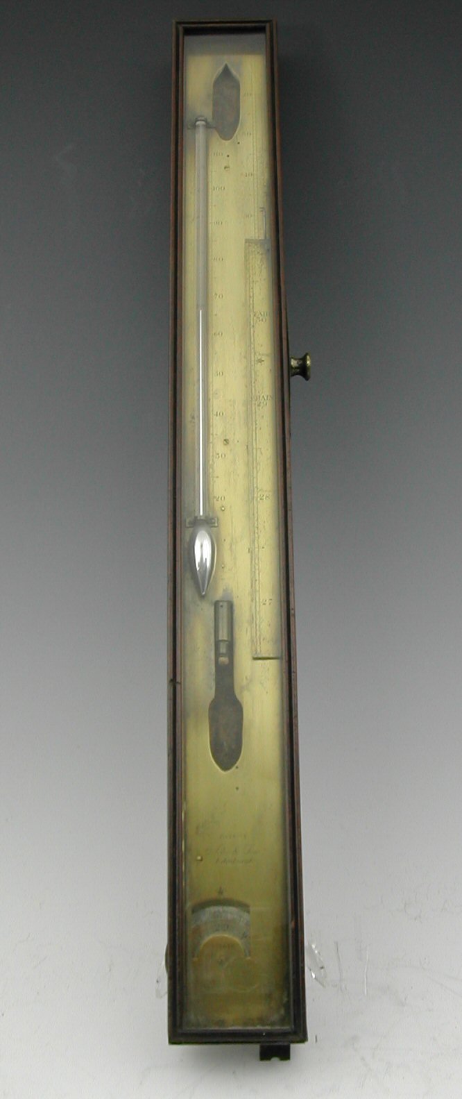 the brass engraved scale with thermometer and sliding vernier, mercury tube lacking, with narrow rectangular mahogany case with beaded edge