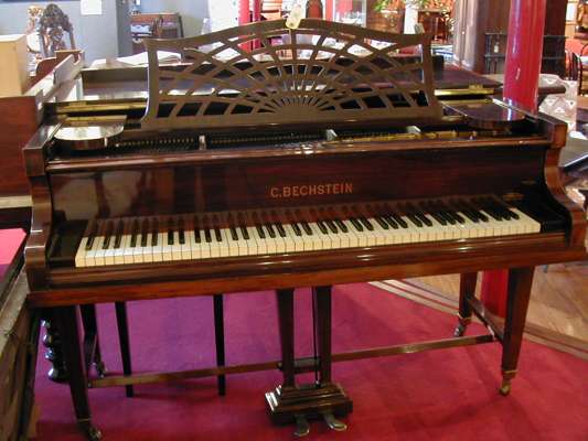 the overstrung iron frame above a keyboard of 7 1/2 octaves on twin square tapering legs, also an associated duet stool (2)