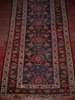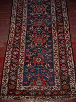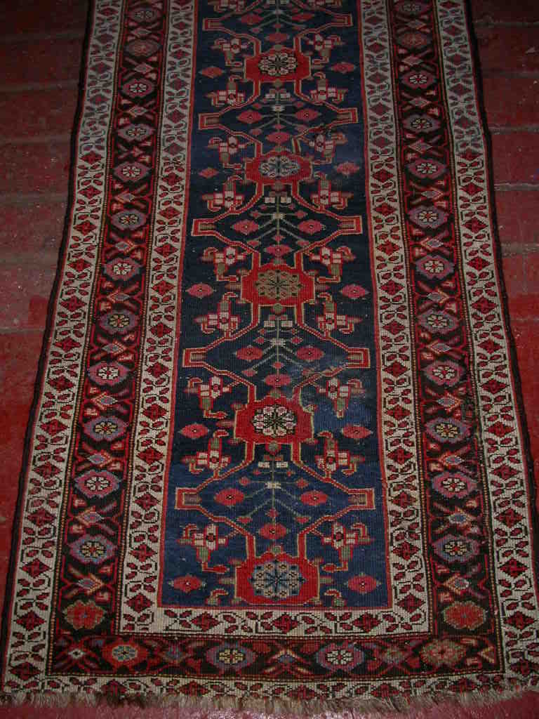 each with indigo field with central row of red rosettes and floral lozenges, within brown rosette and vine border between cream bands (2)