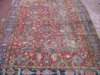 the brick red field with allover flowerhead, serrated leaf and vine pattern, within indigo serrated rosette and vine border between camel bands