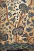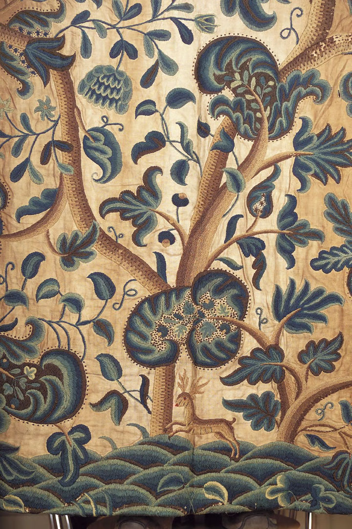 the wool serge ground worked in blue, green and brown wools with stylised forest scene incorporating stags, sprigged chintz cotton lining, one pair 208cm wide x 236cm high, one pair 90cm wide x 238cm high (one curtain folded over and stitched lengthways); and a similar pelmet strip 560cm x 38cm (5)